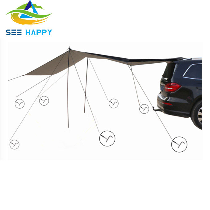 Car Side Canopy é um guarda-sol leve e portátil que é montado na lateral do veículo e fornece proteção contra sol, chuva e vento para passageiros e veículo. Ele usa 2 ferros