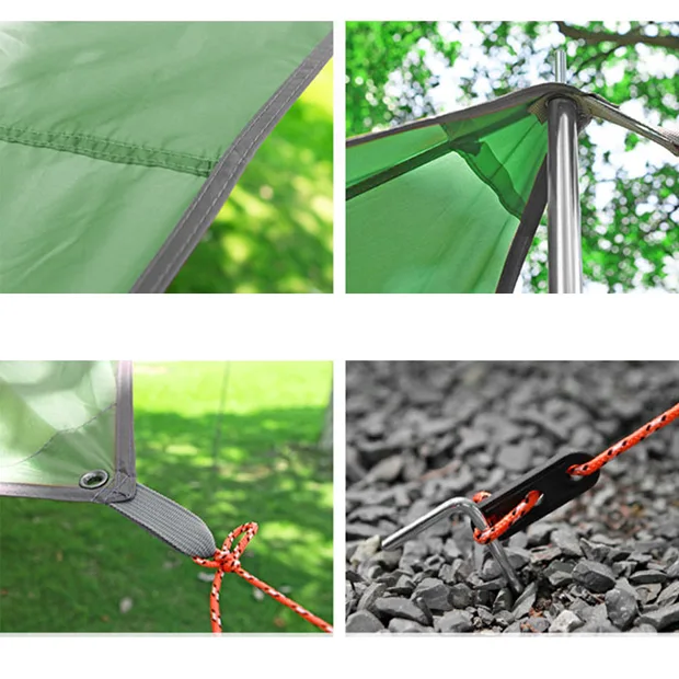 Outdoor Tarp Shelter é uma lona impermeável para exterior projetada para fornecer proteção para atividades ao ar livre, camping e caminhantes. Os materiais desta lona são projetados para repelir a chuva, o vento e os raios UV, tornando-a altamente confiável e durável em ambientes externos. O design do abrigo de lona externa o torna adequado para uma variedade de estilos e ambientes diferentes para atender às diferentes necessidades externas dos usuários. O abrigo de lona externa é fácil de instalar e remover, fornecendo cobertura e cobertura rapidamente. Este abrigo ao ar livre pode ser facilmente transportado na sua bagagem e é a escolha perfeita quer seja um entusiasta do ar livre durante todo o ano ou alguém que apenas ocasionalmente explora e acampa. Outdoor Tarp Shelter é um item obrigatório projetado para atividades ao ar livre. Pode garantir conforto e segurança no ambiente ao ar livre, ao mesmo tempo que fornece um acessório essencial conveniente, durável e prático para entusiastas de atividades ao ar livre.